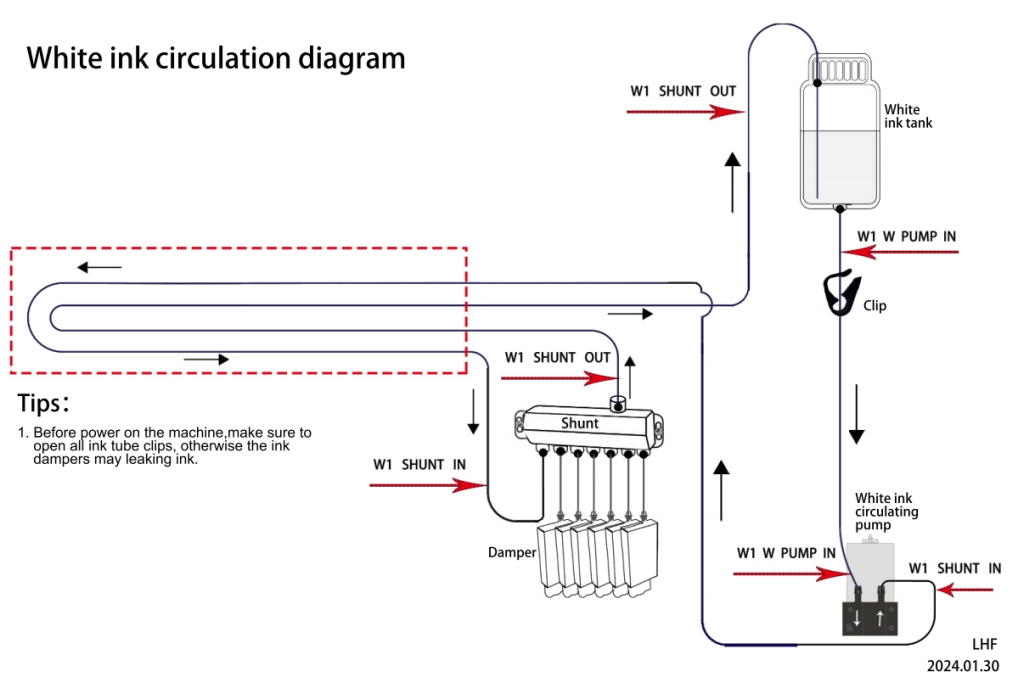 Turn on the printer power, turn on the white ink cycle knob, adjust to the maximum,