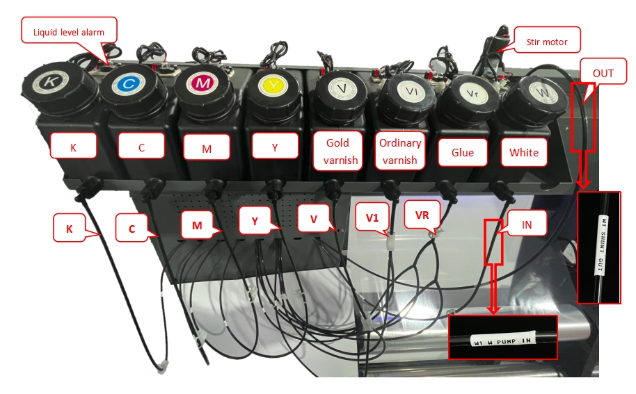 ignore the V ink tank, all the varnish ink tubes are connected to V1 ink tank.