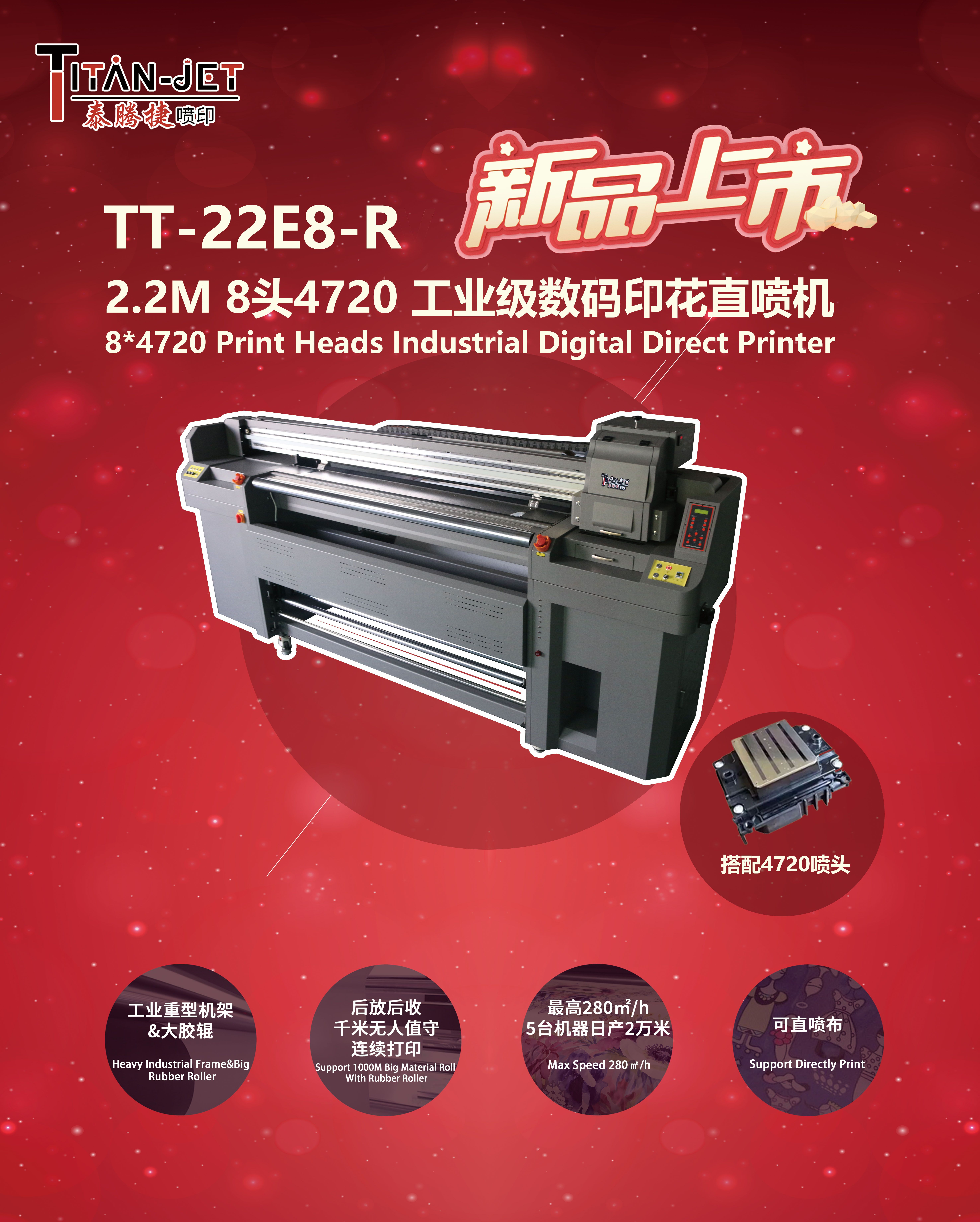 泰拓科技22E8的新一代數(shù)碼印花應(yīng)用方案,獲得不少印花人的認(rèn)可和高度贊同。為了與各印花行業(yè)企業(yè)財富共享、開創(chuàng)數(shù)碼印花的新未來,為了回饋錯過此前展會上現(xiàn)場簽單22E8機(jī)會的客戶,泰拓科技將會在5月20-22日廣州印花展(展位號T2007a)再次強(qiáng)勢展出22E8,工業(yè)級重型機(jī)架的配置搭配8個噴頭,新時代的數(shù)碼印花利器,相信會再次吸引不少印花同行前來觀摩交流。