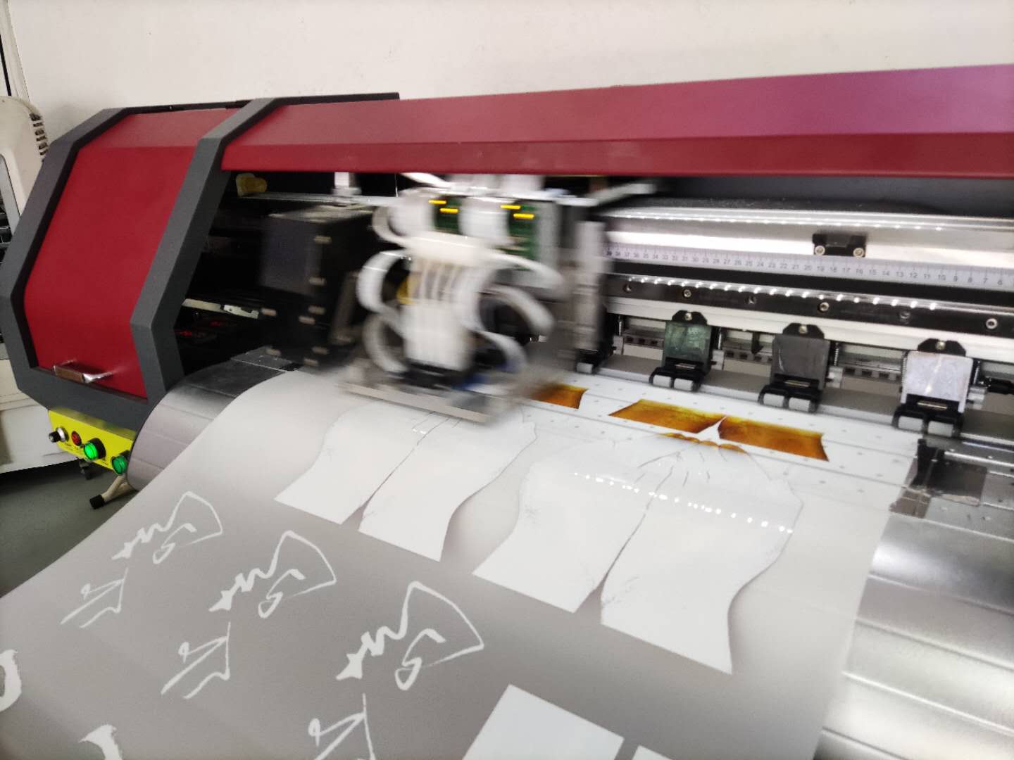 2、柯式燙畫(huà)打印機(jī)開(kāi)始打印,白彩同出,彩色在下,白色覆蓋,可以打印任何顏色的圖案,打印的圖案就是鏤空效果的,無(wú)需再覆膜、刻字。