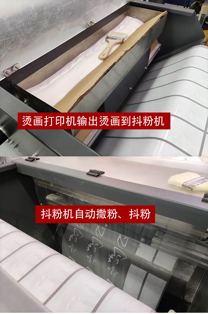 2、設(shè)計(jì)了6段式烘焙系統(tǒng),打印機(jī)前中后三重烘干,打印的圖案再輸出到抖粉機(jī)進(jìn)行預(yù)烘干、加熱熱熔粉、烘干熱熔粉,打印出來(lái)的燙畫(huà)成品可直接進(jìn)行燙壓或收卷,高效快捷。