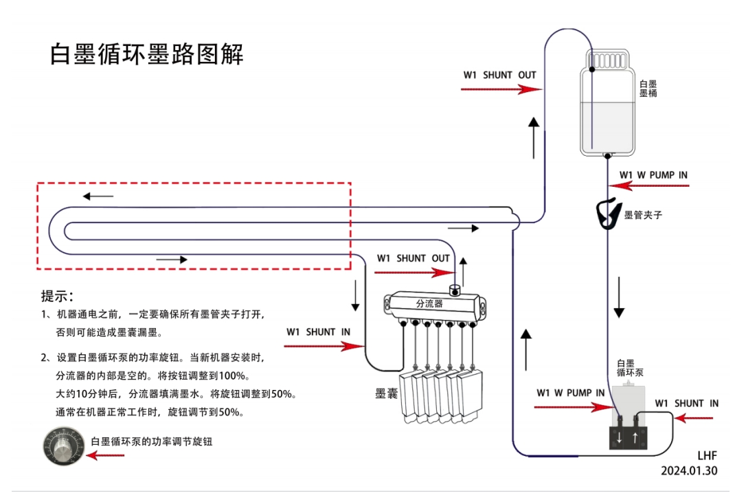 打開打印機電源,打開白墨循環(huán)旋鈕,調(diào)至最大100%,